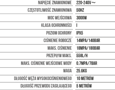 Urządzenie do zastosowania profesjonalnego. Dzięki zastosowaniu silnika indukcyjnego oraz pompy mosiężnej urządzenie sprosta najcięższym pracom przez wiele godzin. Idealnie sprawdzi się przy myciu maszyn rolniczych, samochodów ciężarowych i osobowych jak również do mycia dużych powierzchni elewacji, dachów i kostki brukowej. Długi 10 metrowy wąż wysokociśnieniowy w oplocie stalowym odporny jest na warunki atmosferyczne i wszelkiego rodzaju uszkodzenia mechaniczne oraz pozwala na pracę w obszarze do 310 m2 bez konieczności przenoszenia urządzenia. Dodatkowym atutem jest łożyskowana metalowa lanca szybko złączna zapewniająca wysoki komfort wymiany dysz w zależności od wykonywanej pracy