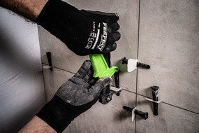6.System samopoziomujący do płytek zakłada się w czasie klejenia, zanim jeszcze przychodzi czas na założenie fugi. Jego celem jest wypoziomowanie płytek. Dzięki temu są na idealnej wysokości, a przestrzenie między nimi są takie same. To sprawia, że układanie płytek jest łatwiejsze, a poziomowanie glazury jest gwarancją idealnie gładkiej i równej podłogi czy ściany. Dla pewności używamy poziomnicy, aby kontrolować czy nasze płytki mają zachowany poziom lub pion.